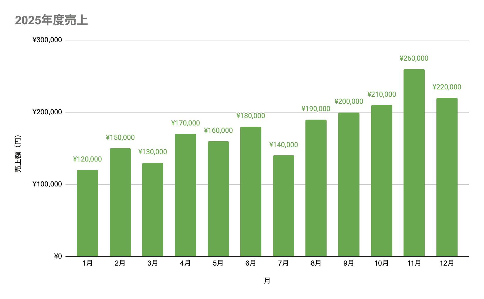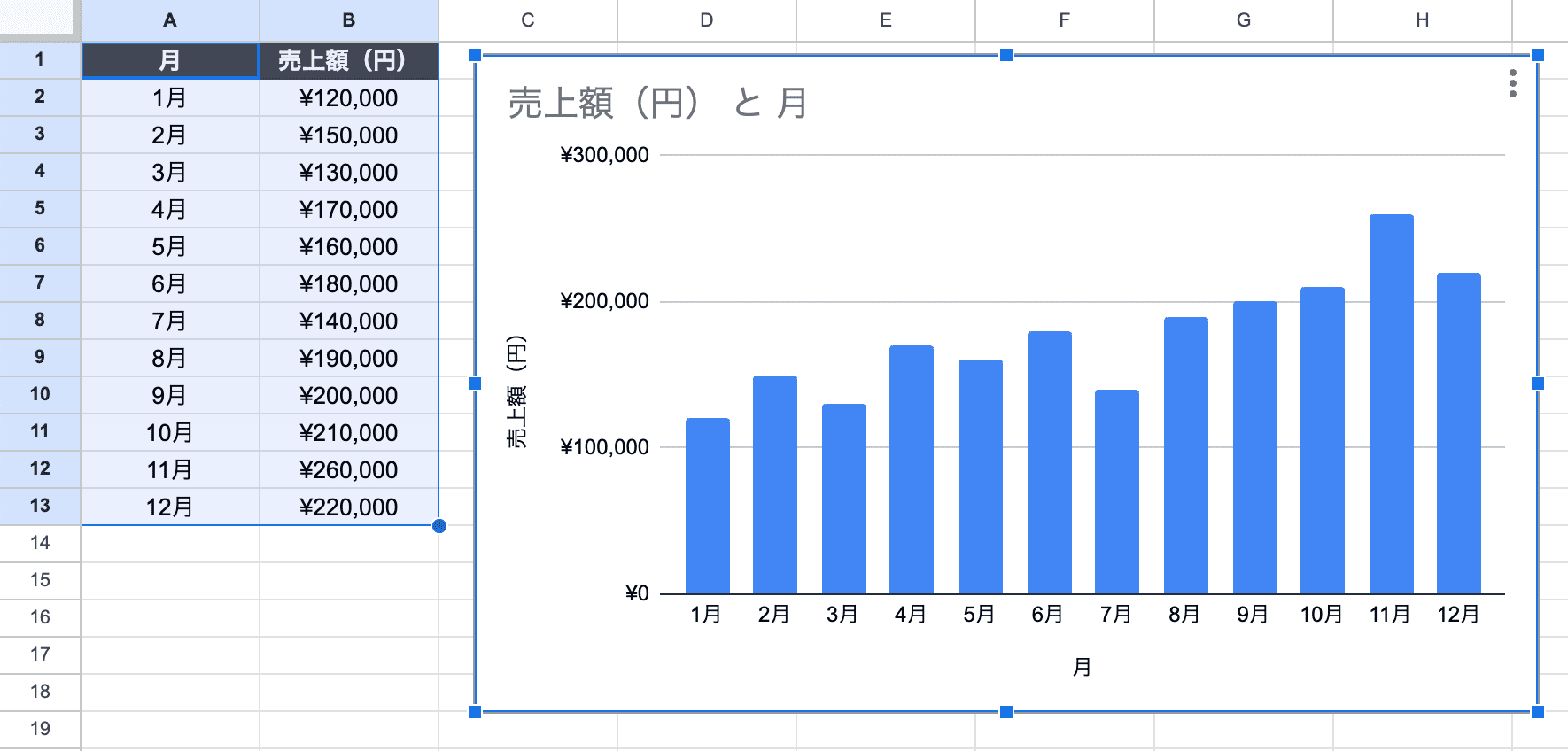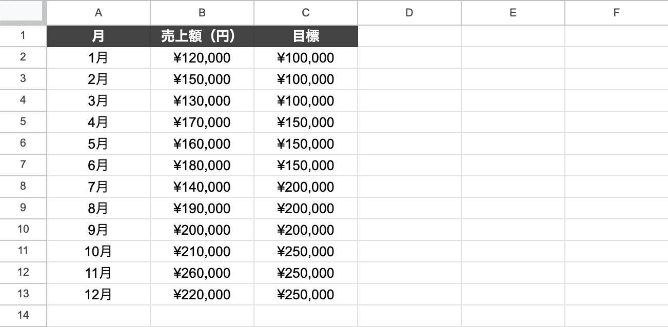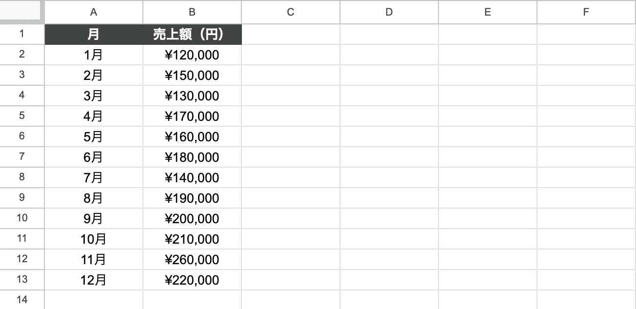 今回は、「1月〜12月の売上額」を例にして、基本の棒グラフを作ってみます。