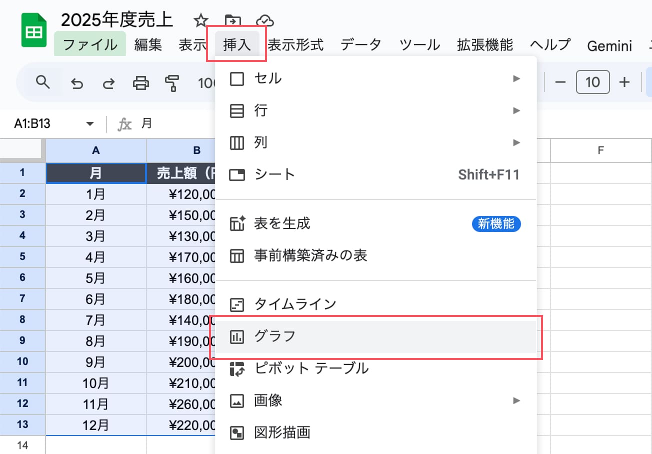 グラフにしたい表のデータの範囲(今回はA1:B13)を選択できたら、メニューの「挿入」から「グラフ」を選択。