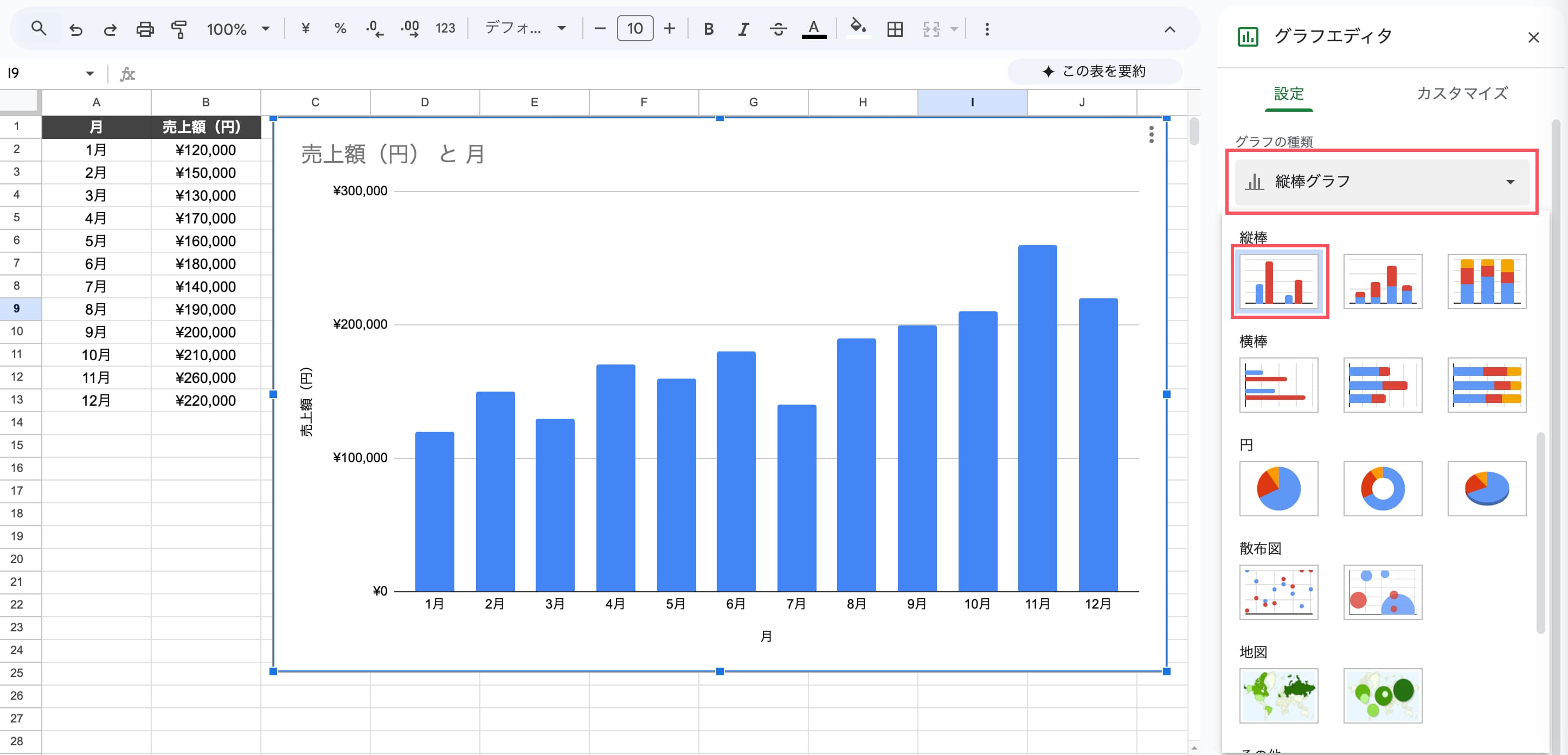 右側に表示されているグラフエディタの設定内、「グラフの種類」から様々な種類のグラフに変換することが出来ます。今回は「縦棒グラフ」を選択すると完成です。グラフを見やすくカスタマイズする方法
