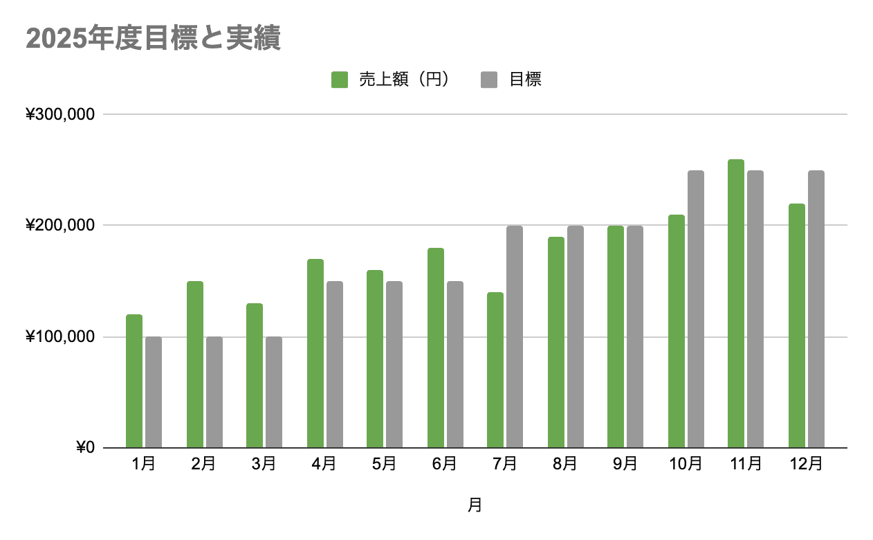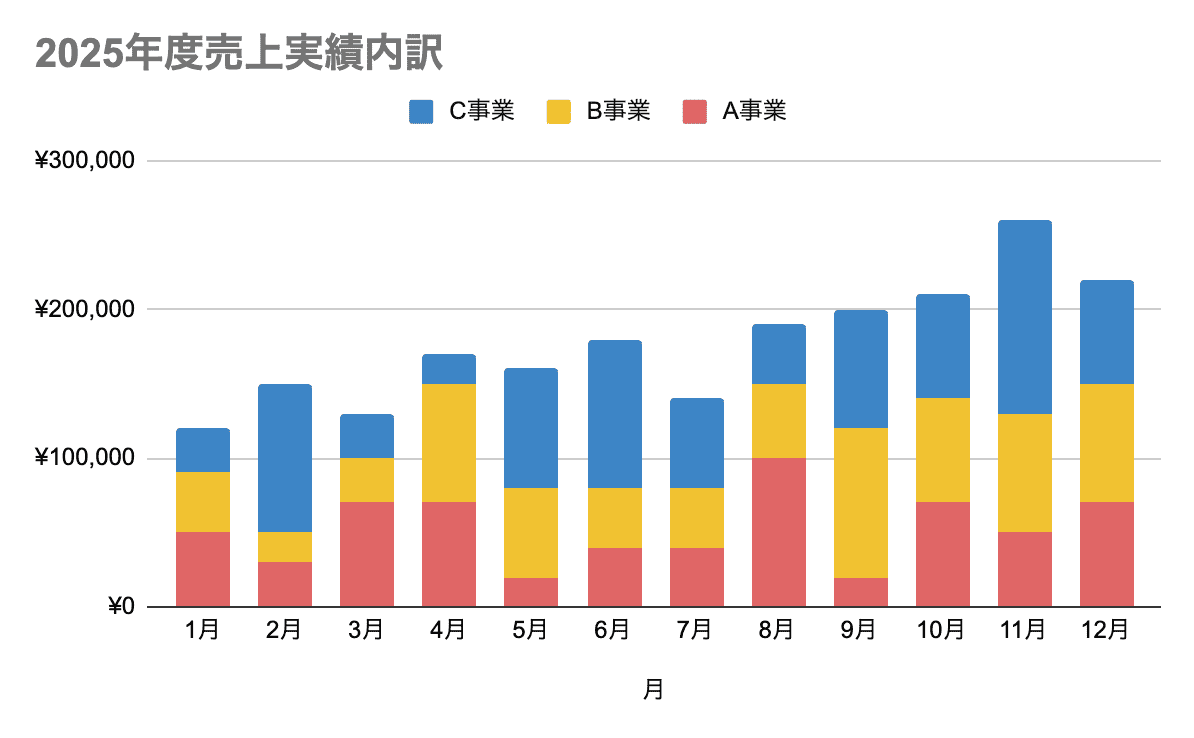 作成したグラフは、右側に表示される「グラフエディタ」→「カスタマイズ」から調整できます。 次は、2つのデータを並べて比較するグラフを作ってみましょう。実績と目標の比較などに便利です。 先ほどの表に、「目標」列を追加して数値を入力します。 先ほどと同様に、グラフにしたい表のデータの範囲を選択し、メニューの「挿入」から「グラフ」を選択。形式は棒グラフにします。 単月の売上推移だけでなく、どの事業がどれくらい売上を占めているかを可視化したい場合などは「積み上げ棒グラフ」が便利です。 先ほどまでは売上額をまとめて記載していましたが、今回は各事業の売上額を、列ごとに入力します。 グラフにしたい表のデータの範囲を選択し、メニューの「挿入」から「グラフ」を選択。今度は「積み上げ縦棒グラフ」にします。 作成したグラフは、画像として書き出すこともできます。 資料に貼り付けたいときや、社内共有用に画像化したいときに便利です。 いかがでしたでしょうか。