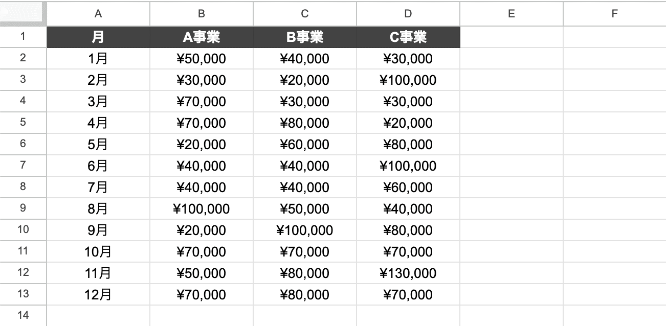 グラフの元となるデータ表を作ります。月と売上金額を1列ずつ入力していきます。