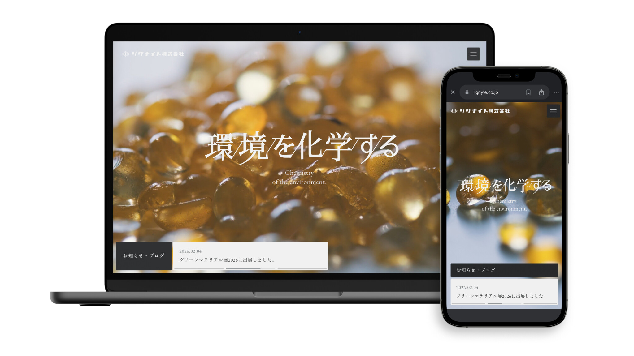 サイト全体のあしらいには、フェノール樹脂の構造を示す「六角形」のモチーフを使用しています。扱っている素材のルーツが、サイトの中に静かに息づくようなデザインを目指しました。 また、長年リグナイト様が大切に掲げてこられた「環境を化学する」というキャッチコピー。今回の制作では、このキャッチコピーを作字させていただきました。文字と文字が「化学式」で結びついているようなデザインにしたのは、素材同士を組み合わせて新しい価値を生み出すリグナイト様の姿勢を、視覚的にも表現したいと考えたからです。 100年という歴史が持つ重厚さと、今もなお新しい挑戦を続ける軽やかさ。その両方が共存するリグナイト様ならではの空気感を表現しています。そして、呉社長が制作開始前に伝えてくださった「スタッフのご家族や大切な方々にも、仕事について知ってほしい」というおもい。 それを受け、今回のリニューアルでは、難しい専門用語ではなく、誰にでも伝わる優しい言葉でフェノール樹脂について説いた「フェノール樹脂とは?」というページを作成しています。普段はなかなか目にすることのない製品が、どのように私たちの暮らしを支え、豊かにしているか。サイトを訪れた大切な方々へ、リグナイト様が担う「誇らしい仕事」の価値がまっすぐに届くようなページに仕上げました。