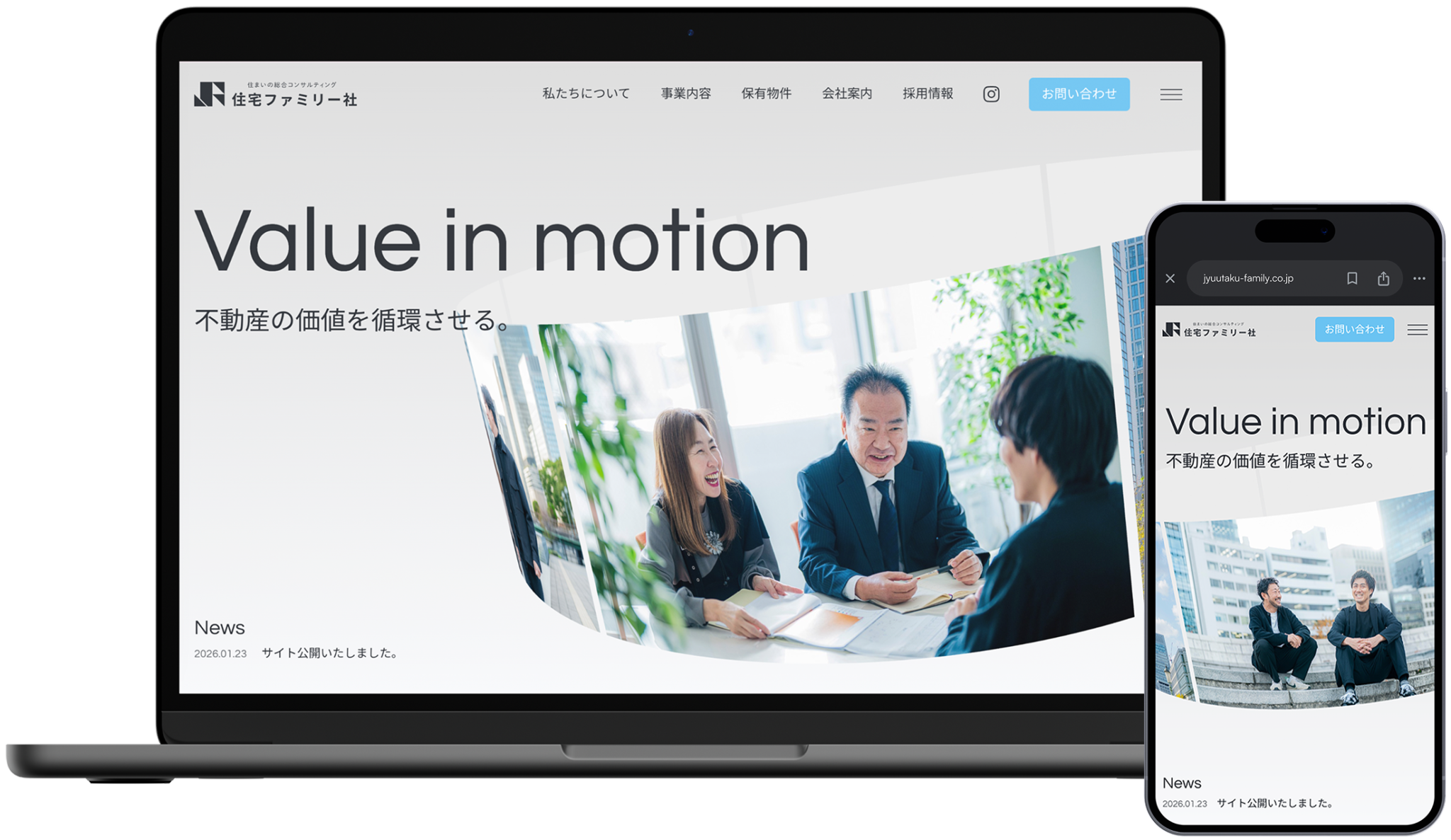 また、今回のサイトのキャッチコピーとして掲げたのが、「Value in motion 不動産の価値を循環させる。」というコンセプトです。 大阪の街に深く根を張り、多くの看板が街の景色に溶け込んでいる住宅ファミリー社様の存在感。そして、今いらっしゃるスタッフ様やこれから入社する方々一人ひとりが、この「箱」の中で新しい価値を見つけ、街の未来を動かしていけるようにという願いや、ここで生まれた信頼が、良い連鎖となって広がっていく存在であってほしいという想いを、この言葉に込めました。